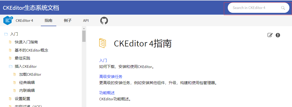 后来我找到了ckeditor的文档:https://ckeditor.com/docs/index.html,找到里面的指南