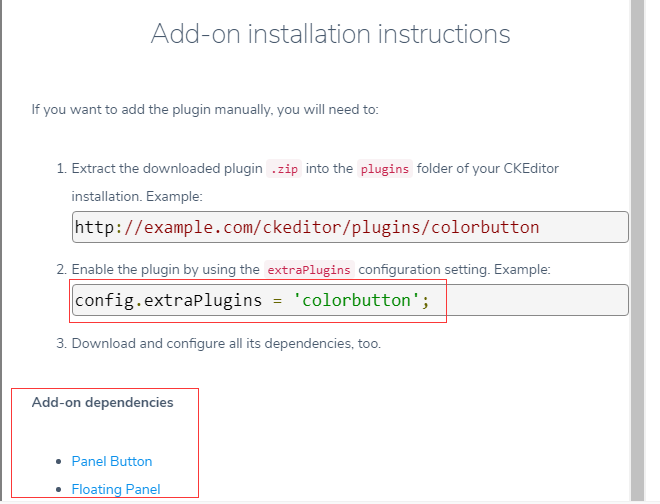 注意 这下面有两个需要添加的依赖(面板按钮和UI按钮),然后点进去依样照葫芦的下载另外两个依赖 ,解压缩,放在ckeditor目录下的plugins目录里