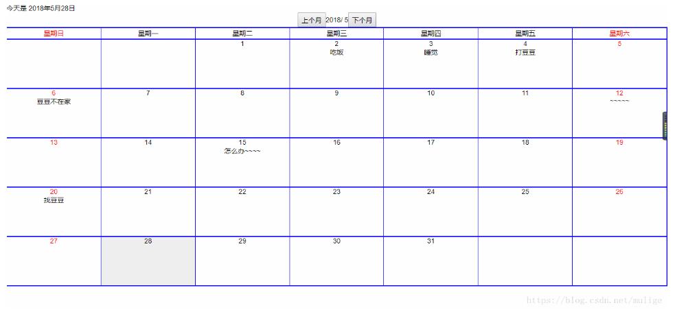 <div id="dateContainer"> <div class="date__showNowTime"> 今天是 <span v-text="ynow"></span>年<span v-text="mnow+1"></span>月<span v-text="dnow"></span>日 </div> <div class="nowTime"> <button class="preMon" @click="preMon">上个月</button> <div class="thisMon"> <span v-text="ynow"></span>/ <span v-text="mnow+1"></span> </div> <button class="nextMon" @click="nextMon">下个月</button> </div> <table border="1" id="table"> </table> </div>