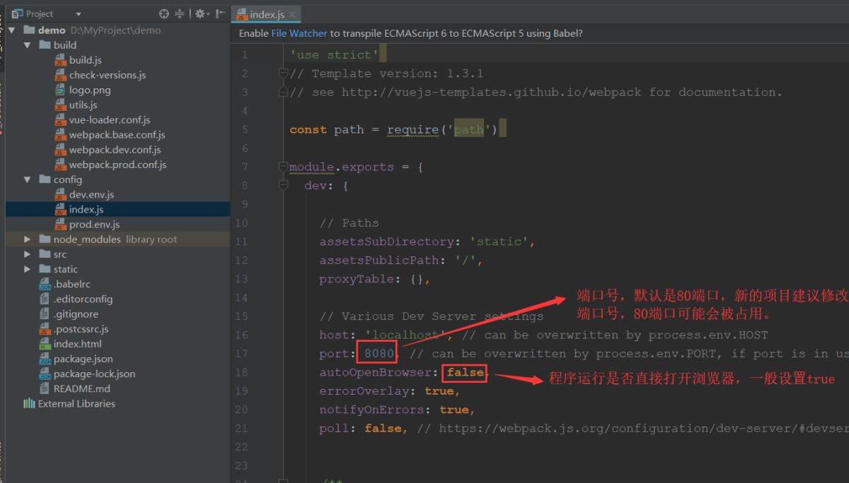 成功之后修改启动项,打开demo>config>index.js,具体修改如下: