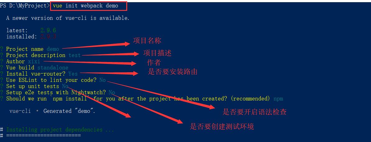 使用命令创建项目,一步步选择之后开始等等项目创建完成