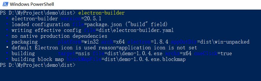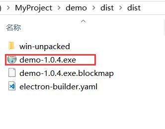以上就是打包成功的效果,demo-1.0.4.exe 就是一个软件包,可以直接安装到系统上,不同的操作系统可以打包成不同的安装包。