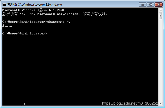 配置完成之后,在cmd命令行中输入 phantomjs -v 检验是否配置成功,配置成功之后,如下图所示: