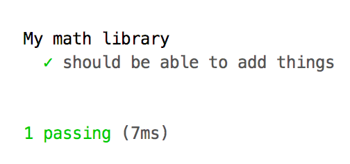 如果您想运行单独的某个单元测试,可以用./node_modules/mocha/bin/mocha --reporter spec --grep "TestName" --require ts-node/register src/**/*.test.ts。“TestName”可以是任何的describe值,在本例中就如./node_modules/mocha/bin/mocha --reporter spec --grep "My math library" --require ts-node/register test/**/*.test.ts。