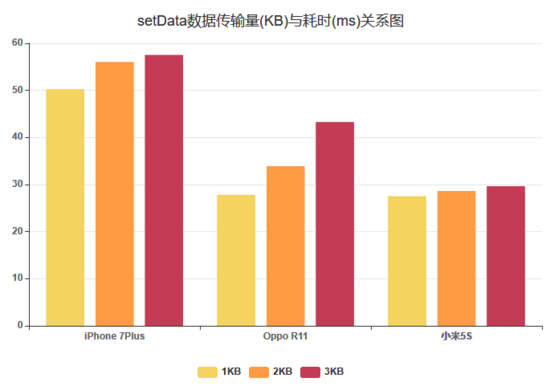 下图是我们做的一组测试统计:在相同网络环境下,各个机型分别对大小为 1KB 、 2KB 、 3KB 的数据执行 setData 操作所消耗的时间。