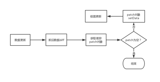除了让开发者自觉遵循规则来减少 setData 数据传输量和执行频率之外,我们还可以自己设计一个 diff 算法,重新对 setData 进行封装,使得在 setData 执行之前,让待更新的数据与原 data 数据做 diff 对比,计算出数据差异 patch 对象,判断 patch 对象是否为空,如果为空则跳过执行更新,否则再将 patch 对象执行 setData 操作,从而达到减少数据传输量和降低执行 setData 频率的目的。
