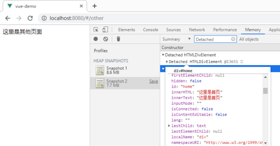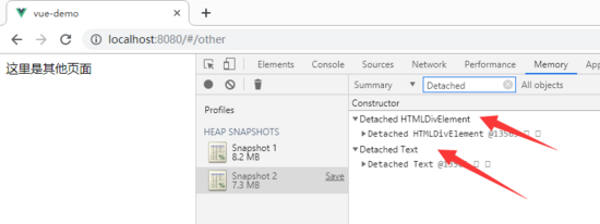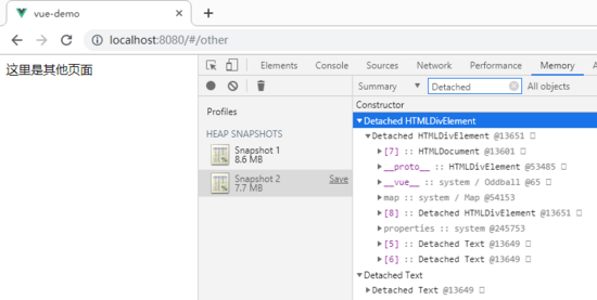 改变路由跳转到other页面,按下Heap snapshots键,搜索Detached,发现有两处dom元素游离于当前页面之外,很明显是window对象引用了home页面中的div,即使此时home页面已经销毁,home中的dom元素却还驻留在内存中无法释放。