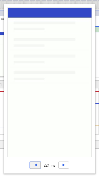 可以看到在通过本地运行访问的情况下(本地访问较快),在进入页面后 221ms 页面先展示骨架屏,随后在 738ms 时完成页面的渲染。