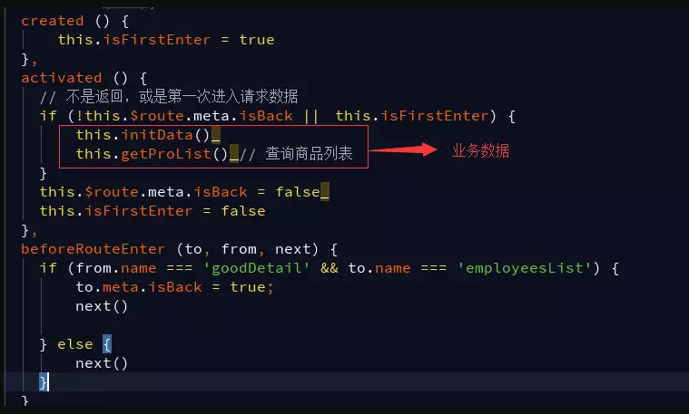 缓存的页面 created 会执行只有一次,activated每次都会执行 , created 里面做 第一次 isFirstEnter = true(由于页面被缓存,所以一直生效),之后再activated 里面做判断 只有 “不是返回回来的” 和 “第一次进来的” 就刷新数据, 并且要在下面 都设为false, 以免缓存各标识不对,在进入 “列表页” 时,通过router钩子函数 beforeRouteEnter做判断,详情页过来的设 isBack 为true,即不刷新页面