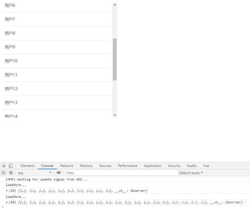 说明一下,这里最主要的就是<mugen-scroll>这个标签,should-handle属性就是是否需要执行加载方法,handler就是加载的具体方法,scroll-container就是指向的元素的ref,需要注意的是,需要滚动加载的元素,如#user-table,需要设置它的具体高度,而且要设置滚动条,就像我在<style>写到的,不然没有效果。
