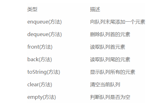 除此之外,队列还有一些其他的操作,比如读取队首的元素,该操作仅返回对头元素并不将它从队列中删除,类似栈的 peek 方法;back 方法读取队尾的元素;toString 方法可以打印当前队列中所有的元素;clear 方法清空当前队列等。