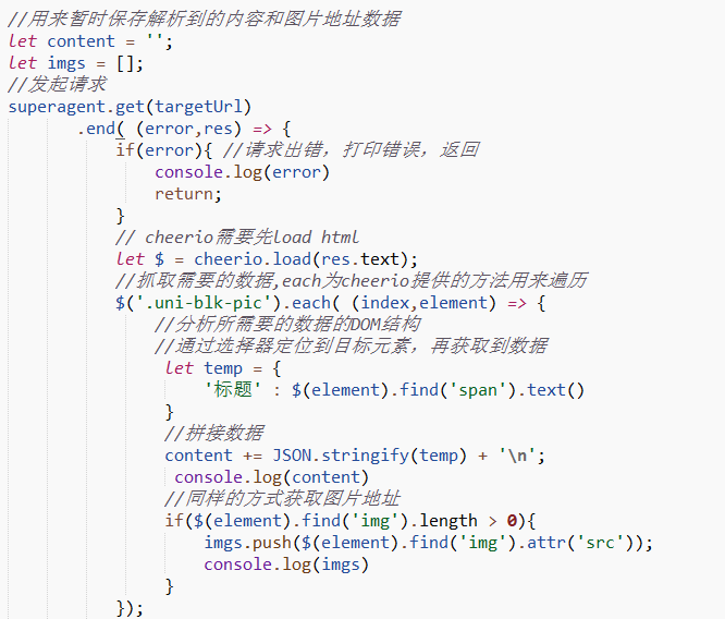 通过superagent请求目标网站,获取到网站内容,通过cheerio.load方法引入要解析的html