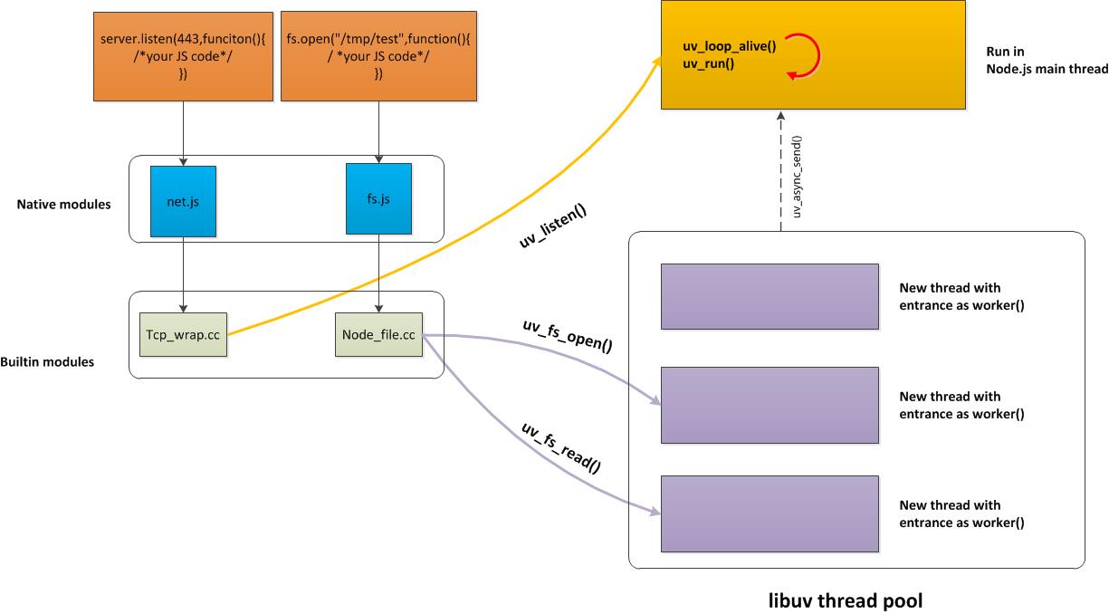 在Nodejs中,libuv则为异步编程的实现提供了可能。libuv为builtin modules 提供了API,这些API用来支撑请求和数据的返回的异步处理方式。
