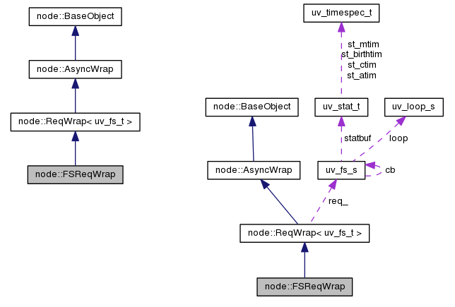 除了FSReqWrap,还有其它Wrap,例如PipeConnectWrap,TCPConnectWrap等等。每个Wrap均为一种请求类型服务。 但是这些wrap,都是node自身的行为,而与libuv相关的是什么呢?上图中表示出了FSReqWrap关键的数据结构 uv_fs_s req__。