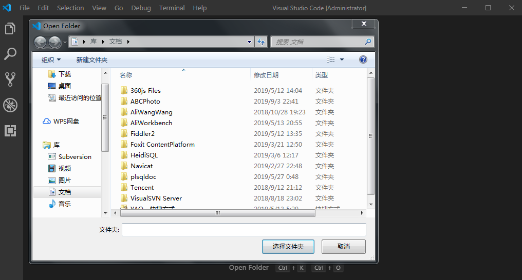 2.启动VsCode,在File---->打开文件夹---->选择前端代码文件夹----->打开