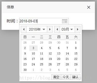 执行,发现无论怎么点击输入框,时间控件都出不来,也就是说,这种写法下,laydate失效了。然后在官网中找到一个帖子上说,把content: $("#layout").html()改成content: $("#layout")即可,惊喜的发现真的可以,效果如下: