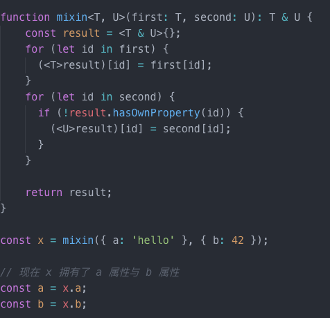 在 JavaScript 中,混入是一种非常常见的模式,在这种模式中,你可以从两个对象中创建一个新对象,新对象会拥有着两个对象所有的功能。交叉类型可以让你安全的使用此种模式: