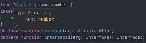 此外,接口创建了一个新的名字,可以在其它任何地方使用。 类型别名并不创建新名字—比如,错误信息就不会使用别名。 在下面的示例代码里,在编译器中将鼠标悬停在interfaced上,显示它返回的是Interface,但悬停在aliased上时,显示的却是对象字面量类型。