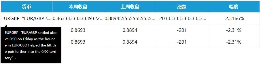 <td>EURGBP“EUR/GBP settled above 0.90 on Friday as the bounce in EUR/USD helped the lift the pair further into the 0.90 territory”.</td>