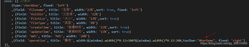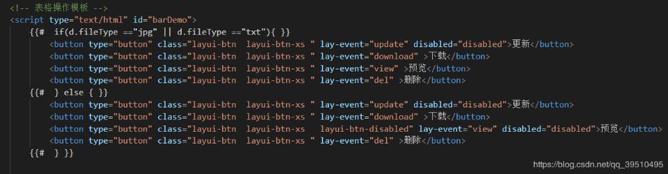 d为迭代表格行数据的形参,d.fileType表示为表格数据一行的某列数据;所以加在一起表示的是当某列值等于txt或者jpg展示上面操作列,否则展示下面的操作列。