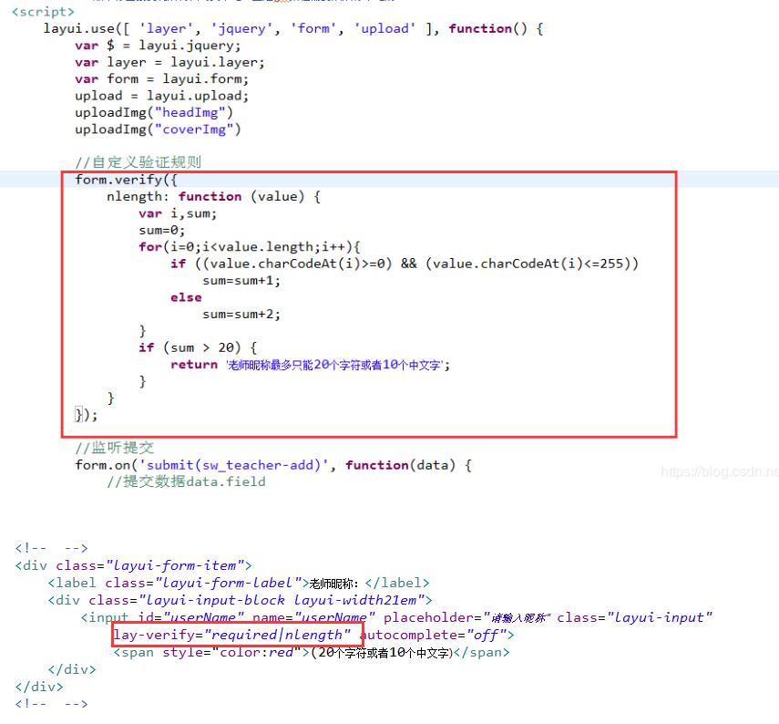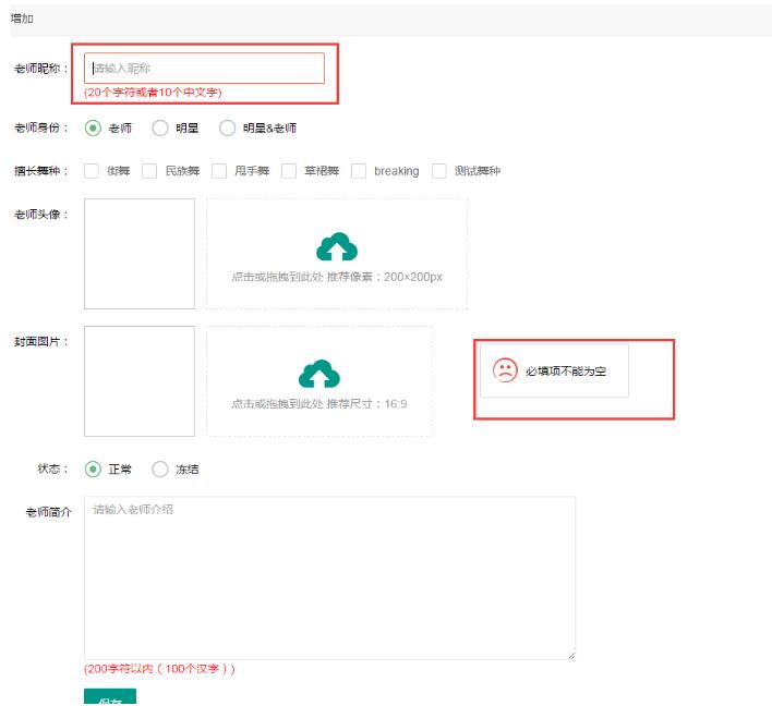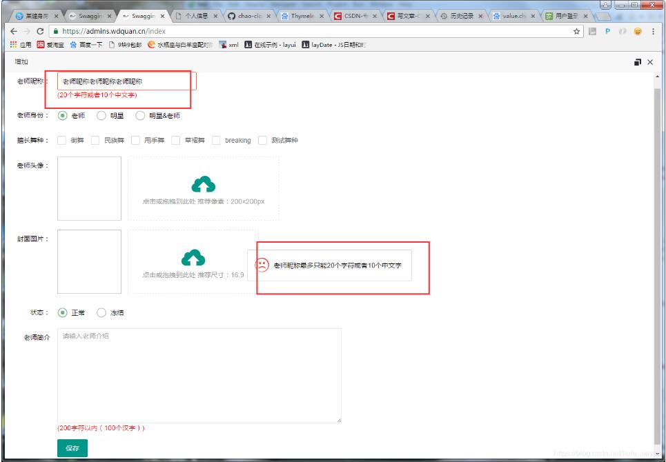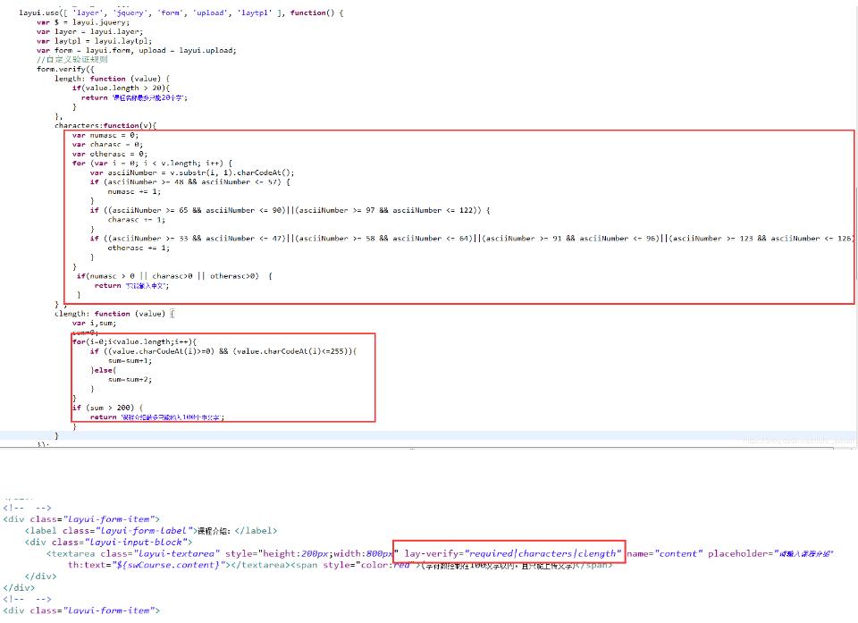 今天写项目遇到一个问题,在输入老师昵称的时候需要控制input输入框不能为空,且字符的长度有限制,英文字符不能超过20,中文不能超过10。输入课程简介的时候,textarea只能输入中文和中文标点,且长度不超过100。使用框架为:Thymeleaf + layui + shiro。