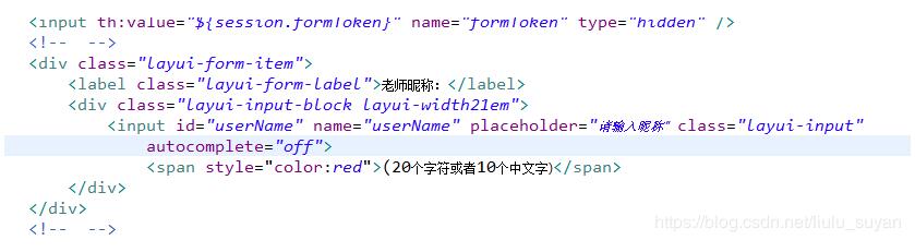 <label class="layui-form-label">老师昵称:</label> <div class="layui-input-block layui-width21em"> <input id="userName" name="userName" placeholder="请输入昵称" class="layui-input" autocomplete="off"> <span style="color:red">(20个字符或者10个中文字)</span> </div>