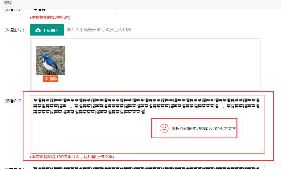 下面,咱们解决下一个问题,填写课程简介的时候,判断长度不能超200且只能好似中文和中文标点。