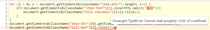 但是由于控制台执行js的代码速度过快,会导致在执行到第7行代码的时候,class属性为“bili-btn”的第3个标签还没加载出来,所以要在执行第7个语句之前让其停顿一下。