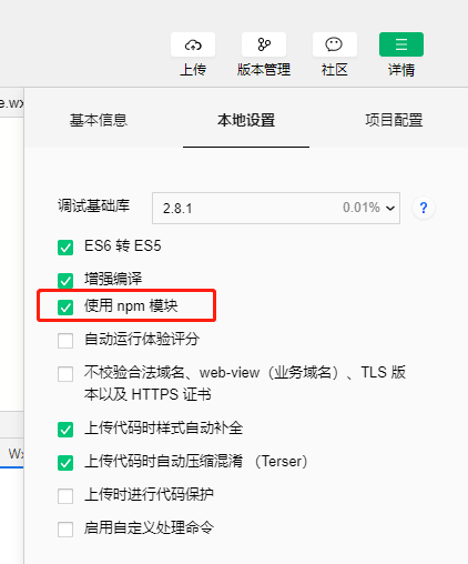 5.点击右上角详情并勾选使用npm模块。