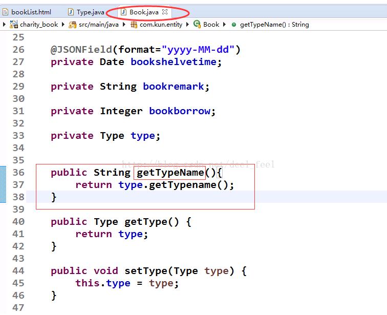 注意,实体类是List泛型对应的实体类。例如我这里是List<Book>,然后我就到我的Book.java中新增一个方法: