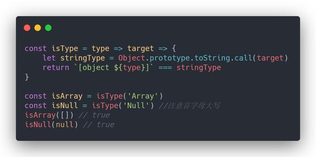 使用 Object.prototype.toString 配合闭包,在保证判断数据类型的准确性时,同时能让这个函数非常灵活,通过传入不同的判断类型来返回不同的判断函数(注意传入 type 参数时首字母大写)。