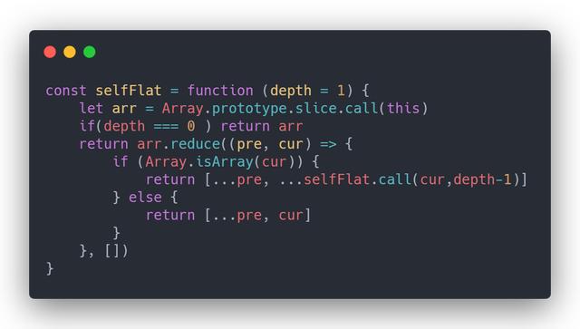原理通过 reduce 遍历数组,遇到数组的某个元素仍是数组时,通过 ES6 的扩展运算符对其进行降维(ES5 可以使用 concat 方法),而这个数组元素可能内部还嵌套数组,所以需要递归调用 selfFlat。