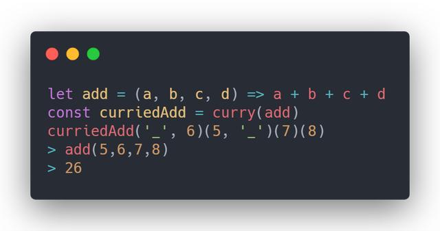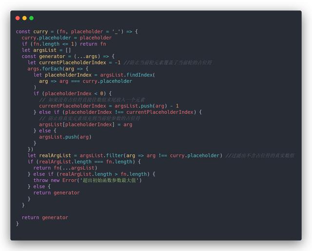 通过占位符能让柯里化更加灵活,实现思路是,每一轮传入的参数先去填充上一轮的占位符,如果当前轮参数含有占位符,则放到内部保存的数组末尾,当前轮的元素不会去填充当前轮参数的占位符,只会填充之前传入的占位符。