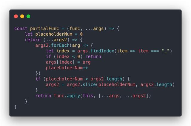 Function.prototype.bind 函数就是一个偏函数的典型代表,它接受的第二个参数开始,为预先添加到绑定函数的参数列表中的参数,与 bind 不同的是,上面的这个函数同样支持占位符。