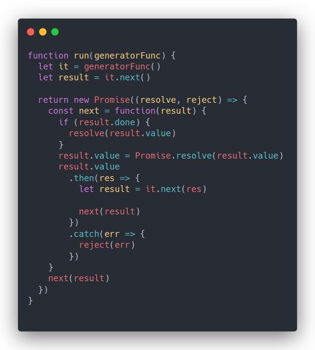 run 函数接受一个生成器函数,每当 run 函数包裹的生成器函数遇到 yield 关键字就会停止,当 yield 后面的 promise 被解析成功后会自动调用 next 方法执行到下个 yield 关键字处,最终就会形成每当一个 promise 被解析成功就会解析下个 promise,当全部解析成功后打印所有解析的结果,衍变为现在用的最多的 async/await 语法。