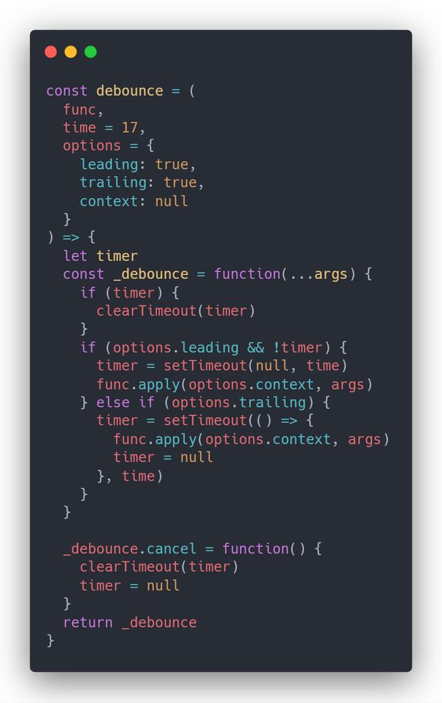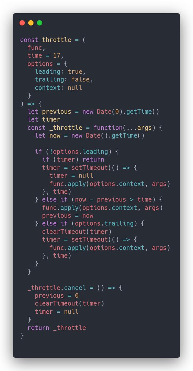leading 为是否在进入时立即执行一次, trailing 为是否在事件触发结束后额外再触发一次,原理是利用定时器,如果在规定时间内再次触发事件会将上次的定时器清除,即不会执行函数并重新设置一个新的定时器,直到超过规定时间自动触发定时器中的函数。