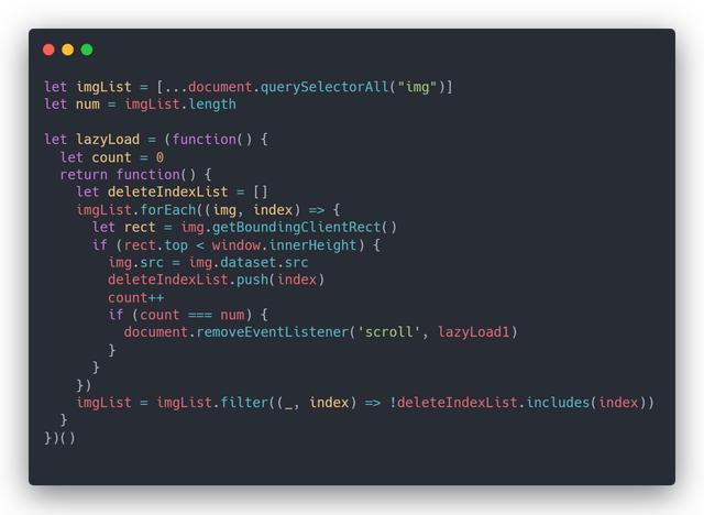getBoundClientRect 的实现方式,监听 scroll 事件(建议给监听事件添加节流),图片加载完会从 img 标签组成的 DOM 列表中删除,最后所有的图片加载完毕后需要解绑监听事件。