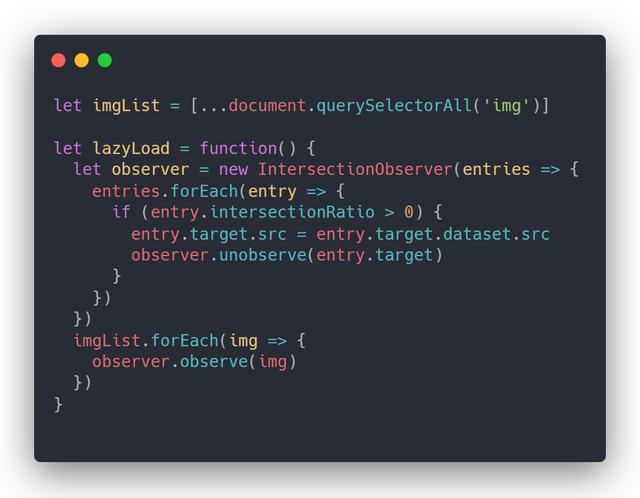 intersectionObserver 的实现方式,实例化一个 IntersectionObserver ,并使其观察所有 img 标签。