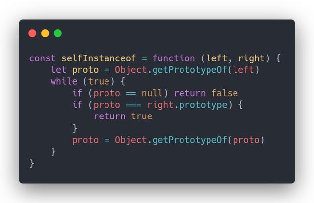 原理是递归遍历 right 参数的原型链,每次和 left 参数作比较,遍历到原型链终点时则返回 false,找到则返回 true。