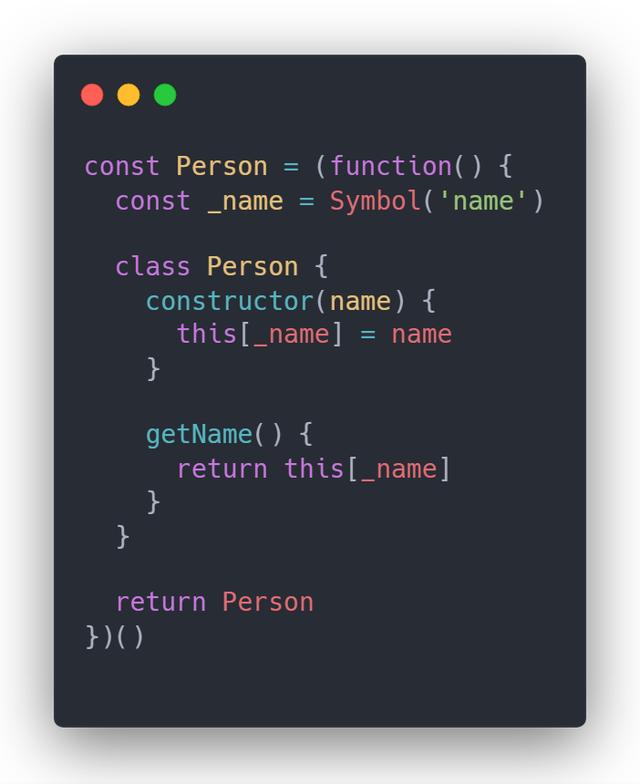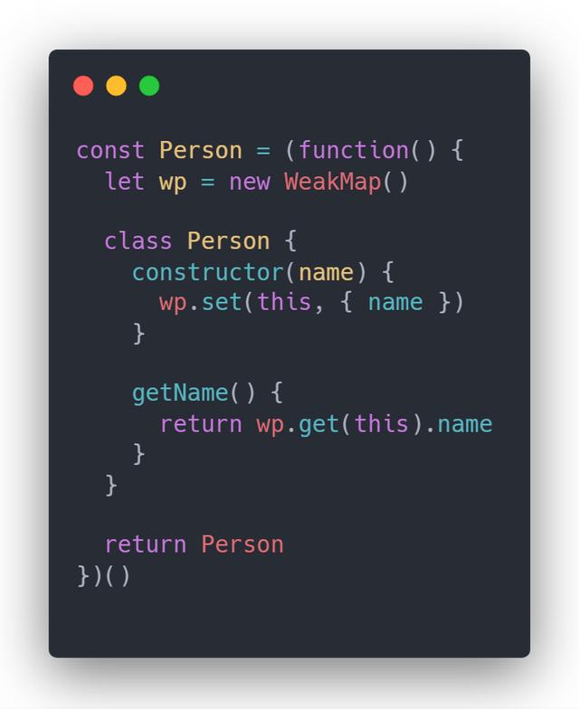 通过 WeakMap 和闭包,在每次实例化时保存当前实例和所有私有变量组成的对象,外部无法访问闭包中的 WeakMap,使用 WeakMap 好处在于不需要担心内存溢出的问题。