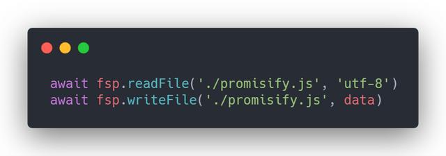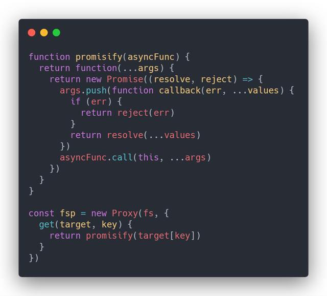 这里还是用了 Proxy 代理了整个 fs 模块,拦截 get 方法,使得不需要手动给 fs 模块所有的方法都包裹一层 promisify 函数,更加的灵活。