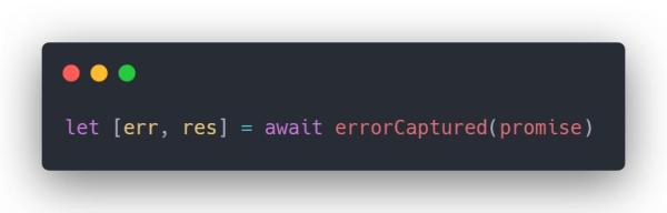 无需每次使用 async/await 都包裹一层 try/catch ,更加的优雅,这里提供另外一个思路,如果使用了 webpack 可以编写一个 loader,分析 AST 语法树,遇到 await 语法,自动注入 try/catch,这样连辅助函数都不需要使用。