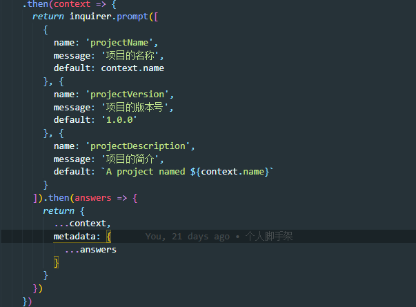 这是一个基本的脚手架,init一个项目,输入项目名称,版本号等信息,然后从git仓库拷贝一份自己需要的项目模板。类似vue的vue-cli或者react的create-react-app,只是这个比较简单.