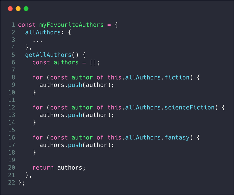 现在,如果要求你循环遍历 myFavouriteAuthors 以获得所有的author,你的方法是什么? 你可能会尝试一些循环组合来获得所有数据。