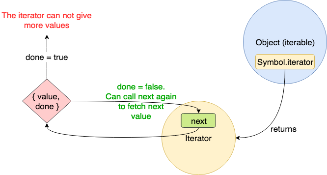 Symbols 提供的名称是唯一的,不能与其他属性名称冲突。同时,Symbol.iterator 返回一个名为迭代器的对象,这个迭代器将拥有一个名为next的方法,该方法将返回一个具有键值为 value 和 done 的对象。