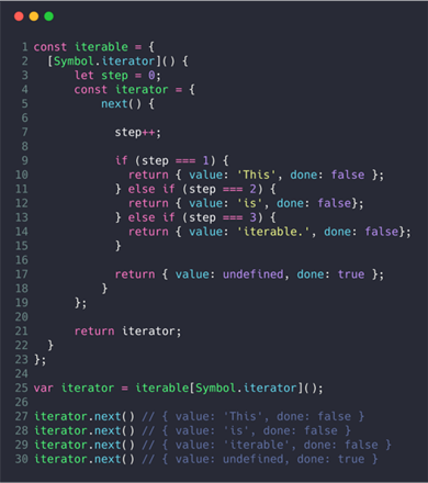 在第4行,我们创建迭代器。它是一个定义了next方法的对象。next方法根据step变量返回值。在第25行,我们检索iterator,27 行,我们调用next方法,直到 done的值为 true。