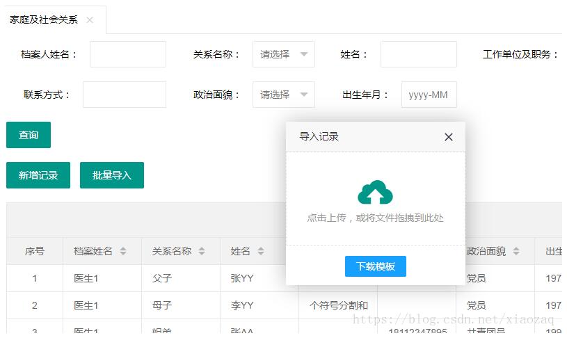 点击【批量导入】按钮调用js脚本importData(config)就可以实现数据上传到服务器。