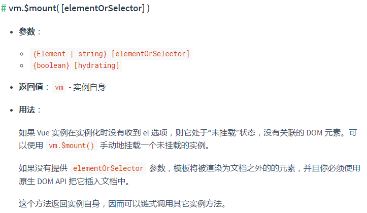 我们希望弹窗组件是在使用时才显示出来,那么就需要动态的向body中添加元素。使用$mount方法可以手动挂载一个vue实例,和 extend 刚好搭配使用,这个也是弹窗组件命令式的关键。