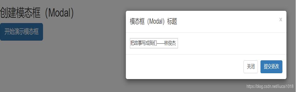 <!DOCTYPE html> <html> <head> <meta charset="utf-8"> <title>Bootstrap 实例 - 模态框(Modal)插件</title> <link rel="stylesheet" href="https://cdn.staticfile.org/twitter-bootstrap/3.3.7/css/bootstrap.min.css" rel="external nofollow" > <script src="https://zhanzhang360.qulang.net/imgupload/008803/jquery.min.js"></script> <script src="https://zhanzhang360.qulang.net/imgupload/008803/bootstrap.min.js"></script> </head> <body> <h2>创建模态框(Modal)</h2> <!-- 按钮触发模态框: class="btn btn-primary btn-lg":是指定class为"按钮的加大primary"样式 data-toggle="modal":应该是模态框的固定写法,只能为modal,至少自己试验发现是这样的 data-target="#myModal":通过选择器指向 id="myModal" 的元素,也就是要显示和隐藏的模态框目标 --> <button class="btn btn-primary btn-lg" data-toggle="modal" data-target="#myModal"> 开始演示模态框 </button> <!-- 模态框(Modal) --> <!-- class="modal fade": modal——用来把div识别成模态框 fade——当模态框被切换时,内容会淡入淡出 id="myModal":就是被指定为上面说的data-target属性选择的元素 tabindex:属性规定元素的 tab 键控制次序 aria-labelledby="myModalLabel":引用模态框的标题(去掉影响不大) aria-hidden:="true":设置模态框不可见,等到点击按钮之后显示 --> <div class="modal fade" id="myModal" tabindex="1" role="dialog" aria-labelledby="myModalLabel" aria-hidden="true"> <div class="modal-dialog"> <div class="modal-content"> <div class="modal-header"> <!-- data-dismiss="modal":加上这个,使得点击该button时会关闭模态框,下面的关闭按钮也是一样加了这个属性 --> <button type="button" class="close" data-dismiss="modal" aria-hidden="true"> × </button> <h4 class="modal-title" id="myModalLabel"> 模态框(Modal)标题 </h4> </div> <div class="modal-body"> <input type="text" placeholder="输入......"> </div> <div class="modal-footer"> <button type="button" class="btn btn-default" data-dismiss="modal">关闭</button> <button type="button" class="btn btn-primary">提交更改</button> </div> </div><!-- /.modal-content --> </div><!-- /.modal --> </div> </body> </html>