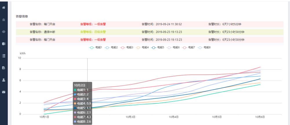 { '日期': '10月3日', '电能1': 1.6, '电能2': 2.6, '电能3': 4.5, '电能4': 1.9,'电能5': 2.3, '电能6': 3.5, '电能7': 5.3, '电能8': 3.2 },